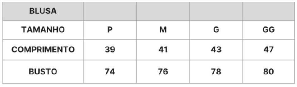 - Vestindo: 36/38 (P) | 40 (M) | 42 (G) | 44 (GG)