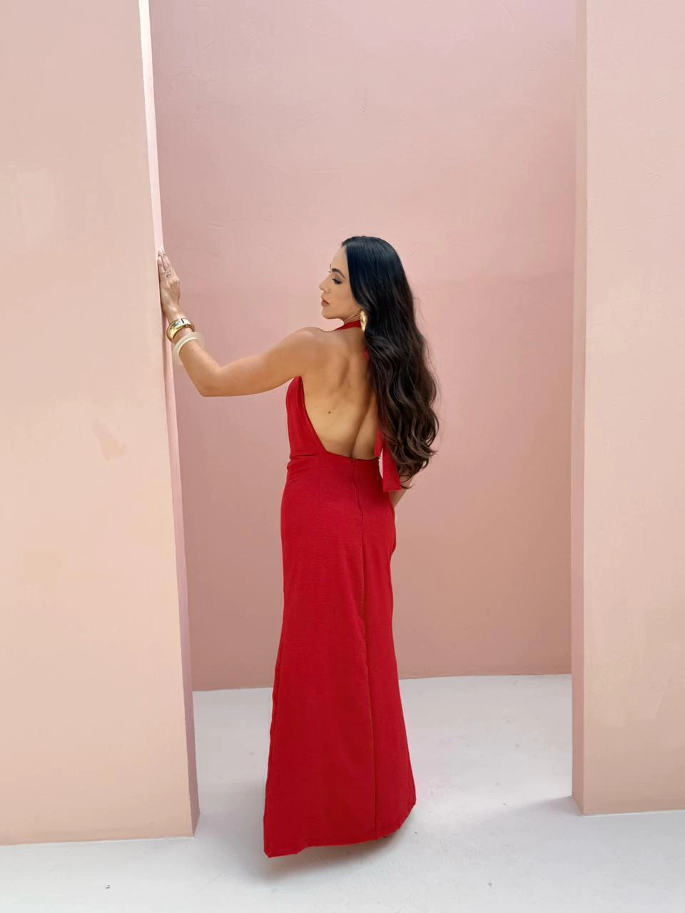 Um vestido que exala sofisticação e poder feminino, confeccionado em tecido fluido com toque acetinado, o modelo traz decote degagê (drapeado), que valoriza o colo de forma elegante e moderna, a modelagem é ajustada na cintura, destacando as curvas na medida certa, enquanto a fenda frontal adiciona sensualidade e movimento ao look, o comprimento longo e a amarração no pescoço garantem um caimento impecável e um visual marcante para eventos noturnos, festas ou ocasiões especiais.